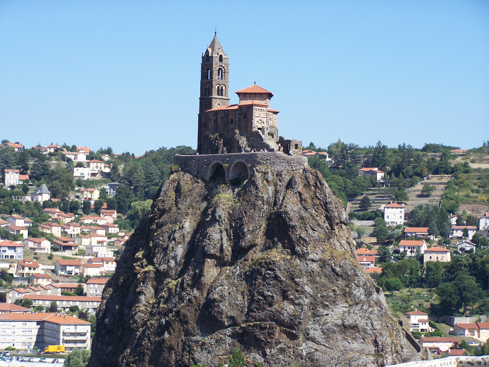 Située au sommet d’un piton rocheux de plus de 80m, d’origine volcanique, c’est un bijou d’architecture. On y accède au bout de 268 marches, mais l’ascension vaut vraiment le coup. Elle fut érigée au début du Xème siècle par l’évêque du Puy au retour d’un pèlerinage à Saint-Jacques de Compostelle, sur le site d’un ancien temple romain dédié au dieu Mercure, elle fut inaugurée en 972.